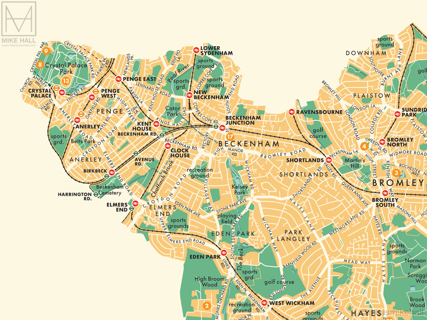 Bromley (London borough) retro map giclee print โ Mike Hall Maps